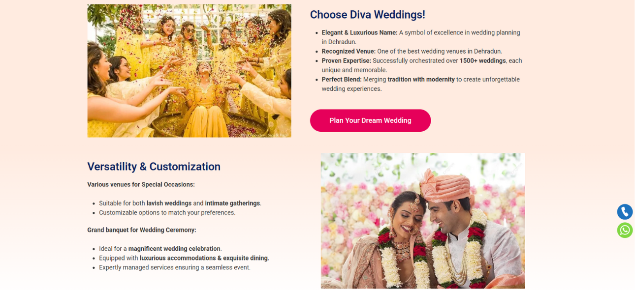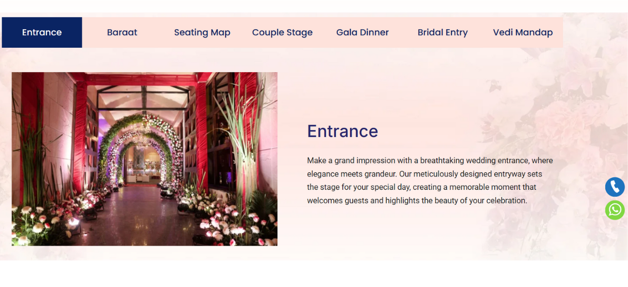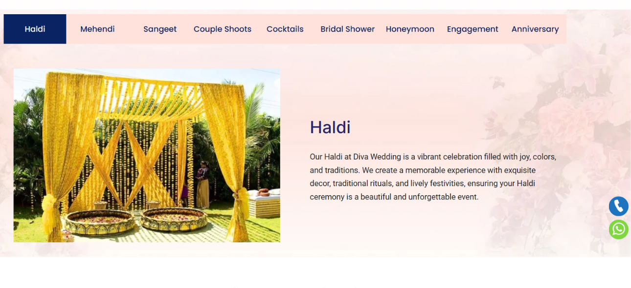 The website is strategically designed to highlight a wide range of wedding festivities including Haldi, Mehendi, Sangeet, Gala dinners, Bride & Groom entries, cocktail parties, and more, complete with exquisite décor and customized event themes.