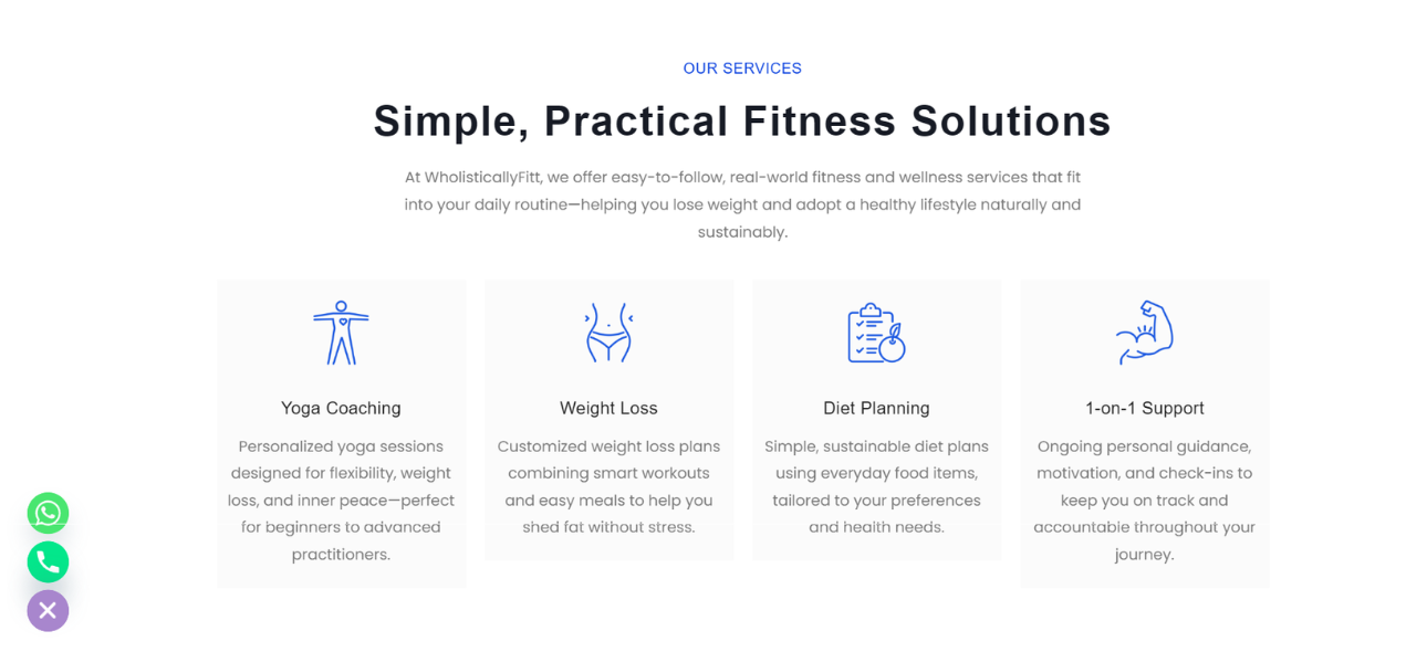 WholisticallyFitt is a WordPress health and wellness website developed to provide structured yoga, fitness, and lifestyle coaching tailored to users’ personal goals. The platform highlights detailed service offerings such as guided yoga routines, strength and flexibility plans, and holistic approaches to fitness and weight management. With a responsive layout and organized content, this project demonstrates the creation of a professional wellness platform that engages visitors and converts them into users seeking sustainable health and fitness solutions. Designed to be responsive across devices, the site ensures seamless accessibility from desktops, tablets, and smartphones. Strategic call-to-action elements like Contact for Consultation or Join Yoga Sessions help convert visitors into active clients. This project showcases the ability to build a professional, wellness-focused digital presence that engages users and supports meaningful lifestyle changes.Â